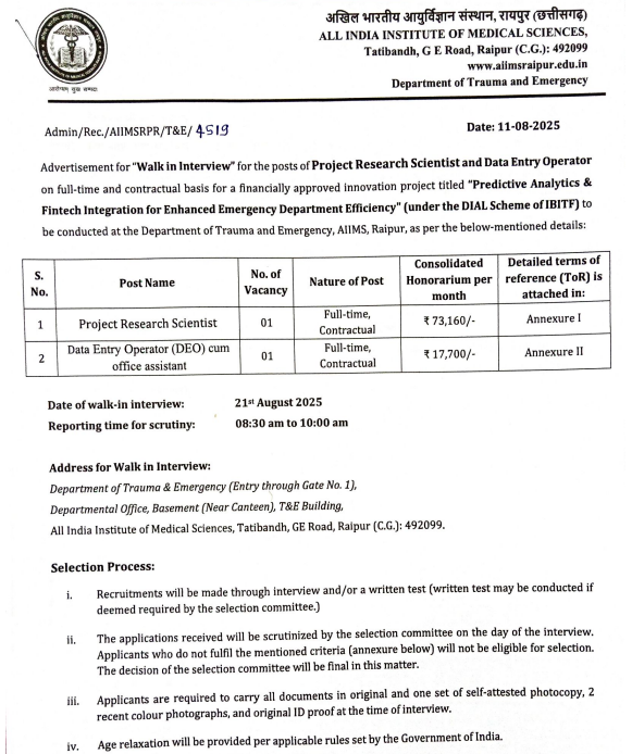 - इंटरव्यू का पता: Department of Trauma & Emergency (Entry through Gate No. 1), Departmental Office, Basement (Near Canteen), T&E Building, All India Institute of Medical Sciences, Tatibandh, GE Road, Raipur (C.G.): 492099.