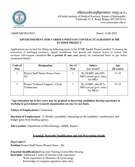 Staff Nurse vacancy Raipur अखिल भारतीय आयुर्विज्ञान संस्थान (AIIMS), रायपुर ने एक ICMR फंडेड प्रोजेक्ट के लिए प्रोजेक्ट स्टाफ नर्स और प्रोजेक्ट टेक्निकल सपोर्ट (लैब टेक्नीशियन) के पदों पर भर्ती की घोषणा की है। Lab Technician jobs Chhattisgarh
