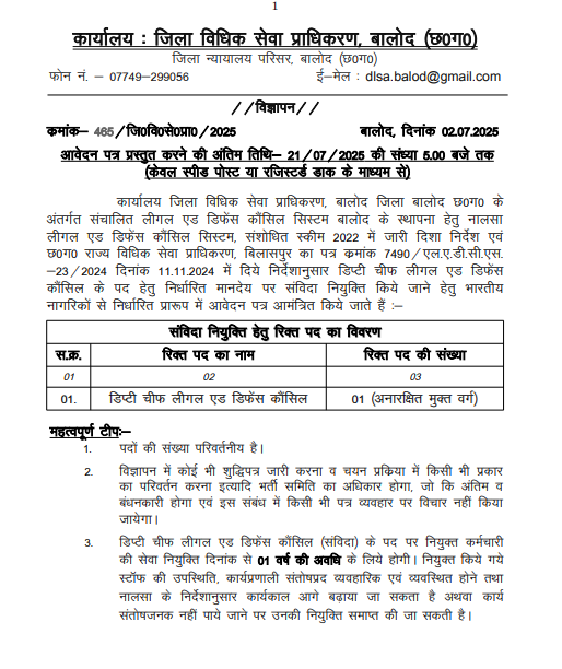 | भर्ती विभाग | जिला विधिक सेवा प्राधिकरण, बालोद (DLSA Balod) |