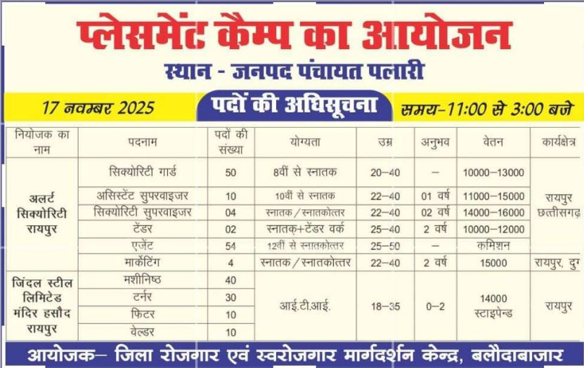 Balodabazar Placement Camp 2025:17 नवंबर 2025 को जनपद पंचायत पलारी, बलौदाबाजार में एक विशाल प्लेसमेंट कैंप का आयोजन हो रहा है। अलर्ट सिक्योरिटी और जिंदल स्टील जैसी कंपनियां 200 से ज्यादा पदों पर भर्ती कर रही हैं। 8वीं, 10वीं, 12वीं, आईटीआई और ग्रेजुएट पास उम्मीदवार आवेदन कर सकते हैं। पूरी जानकारी पाएं।