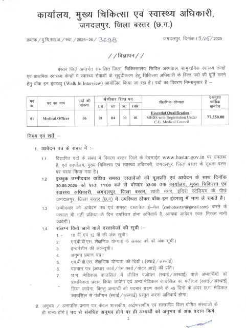 Bastar Medical Officer Vacancy 2025: CMHO जगदलपुर, बस्तर में मेडिकल ऑफिसर के 06 पदों पर सीधी भर्ती। MBBS पास उम्मीदवार 30 मई 2025 को वॉक-इन-इंटरव्यू में भाग लें। जानें पूरी प्रक्रिया, योग्यता, और वेतनमान। छत्तीसगढ़ सरकारी नौकरी