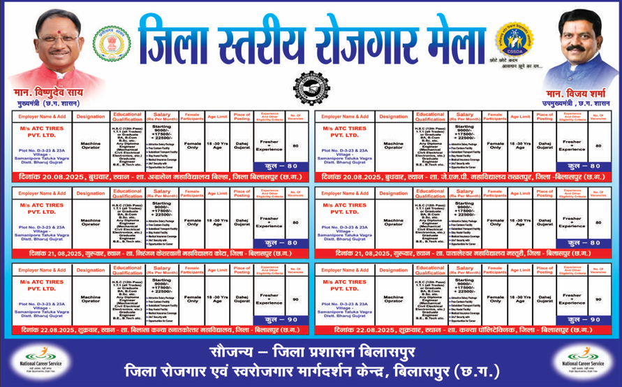 Bilaspur Rojgar Mela 2025: जिला प्रशासन बिलासपुर आपके लिए एक सुनहरा अवसर लेकर आया है। प्रसिद्ध टायर निर्माता कंपनी, M/s ATC टायर्स प्राइवेट लिमिटेड, बिलासपुर में एक विशाल “जिला स्तरीय रोजगार मेला” का आयोजन करने जा रही है। Campus placement in Bilasa Girls College इस मेले के माध्यम से कंपनी 500 से भी ज्यादा पदों पर केवल महिलाओं की भर्ती करेगी। ATC Tires Recruitment 2025