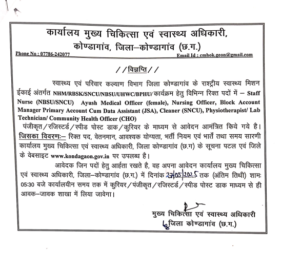 Staff Nurse jobs Kondagaon: कार्यालय मुख्य चिकित्सा एवं स्वास्थ्य अधिकारी (CMHO), कोण्डागांव, जिला-कोण्डागांव (छ.ग.) ने राष्ट्रीय स्वास्थ्य मिशन (NHM) के अंतर्गत विभिन्न पदों पर भर्ती के लिए एक विस्तृत विज्ञापन (क्रमांक-1/2025, दिनांक 17/05/2025) जारी किया है। यह भर्ती विभिन्न कार्यक्रमों जैसे NHM/RBSK/SNCU/NBSU/UHWC/BPHU के तहत संविदा आधार पर की जाएगी।