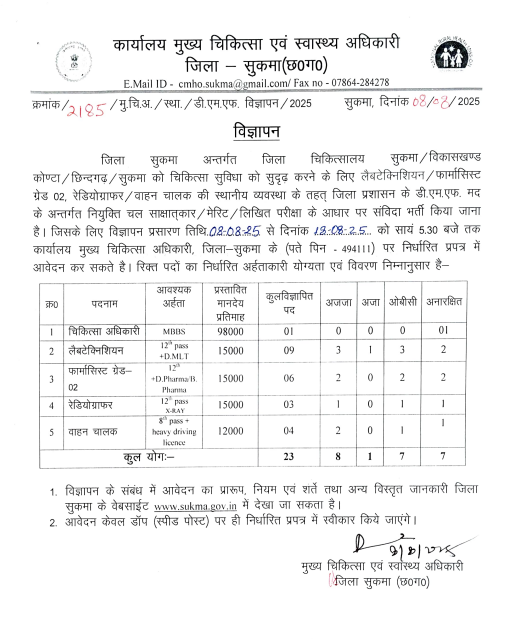 CMHO Sukma Bharti 2025: मुख्य चिकित्सा एवं स्वास्थ्य अधिकारी, जिला – सुकमा (छ०ग०) ने विभिन्न पदों पर संविदा भर्ती के लिए विज्ञापन जारी किया है। यह भर्ती जिला प्रशासन के डी.एम.एफ. मद के तहत की जा रही है, जो चिकित्सा सुविधाओं को सुदृढ़ करने के उद्देश्य से है। इसमें चिकित्सा अधिकारी, लैब टेक्नीशियन, फार्मासिस्ट ग्रेड 02, रेडियोग्राफर और वाहन चालक जैसे महत्वपूर्ण पद शामिल हैं। CMHO Sukma Vacancy 2025