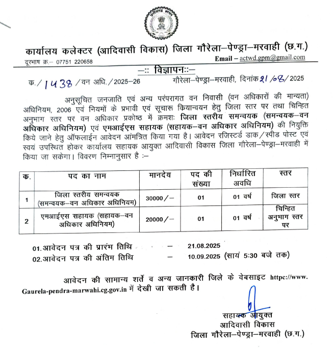 Gaurela-Pendra-Marwahi Vacancy 2025: कार्यालय कलेक्टर (आदिवासी विकास), जिला गौरेला-पेण्ड्रा-मरवाही (GPM) ने वन अधिकार अधिनियम के प्रभावी कार्यान्वयन के लिए विभिन्न पदों पर भर्ती की घोषणा की है। Coordinator vacancy in GPM