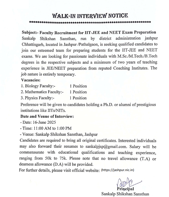 IIT JEE NEET coaching Teacher vacancy 2025: संकल्प शिक्षण संस्थान, जशपुर (छत्तीसगढ़) में IIT-JEE/NEET परीक्षा तैयारी के लिए बायोलॉजी, मैथ्स, फिजिक्स फैकल्टी की भर्ती। वॉक-इन इंटरव्यू 16 जून 2025। सैलरी ₹50k-₹75k। पूरी जानकारी और आवेदन प्रक्रिया के लिए पढ़ें। #SankalpJashpur #FacultyRecruitment #TeachingJobsCG