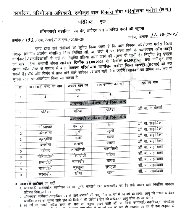 पता: बाल विकास परियोजना कार्यालय, मनोरा, जिला-जशपुर (छत्तीसगढ़) याद रखें, आवेदन केवल पंजीकृत डाक या स्पीड पोस्ट से ही भेजना है। सीधे हाथ से या देर से जमा किए गए आवेदन स्वीकार नहीं किए जाएंगे।