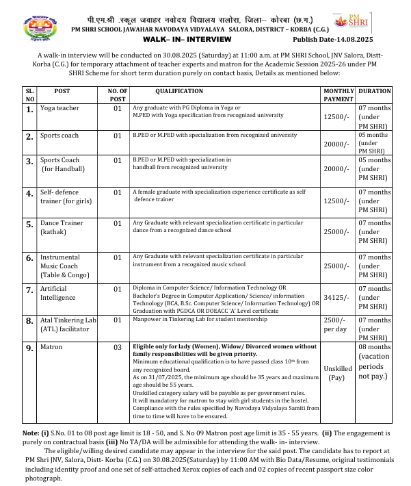 - इंटरव्यू स्थल: पीएम श्री स्कूल, JNV सलोरा, जिला- कोरबा (छत्तीसगढ़) के पते पर जाना होगा।