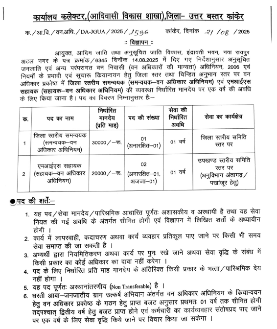 Kanker Collector Office Recruitment 2025 कार्यालय कलेक्टर, (आदिवासी विकास शाखा), जिला- उत्तर बस्तर कांकेर ने जिला स्तरीय समन्वयक (District Level Coordinator) और एमआईएस सहायक (MIS Assistant) के पदों पर भर्ती के लिए एक विज्ञापन जारी किया है। कांकेर जिला भर्ती 2025 यह भर्ती उन युवाओं के लिए एक सुनहरा अवसर है जो समाज के लिए काम करना चाहते हैं और सरकारी क्षेत्र में अपना करियर बनाना चाहते हैं।