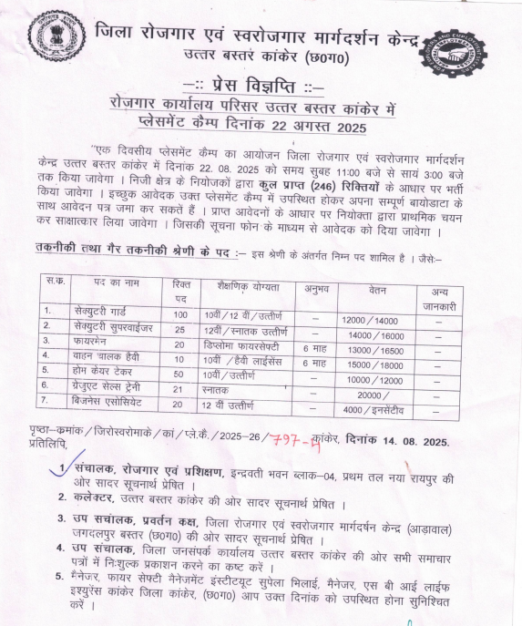 Placement Camp in Kanker 🎯यह भर्ती अभियान जिला रोजगार एवं स्वरोजगार मार्गदर्शन केंद्र द्वारा आयोजित किया जा रहा है, जिसका उद्देश्य जिले के बेरोजगार युवाओं को रोजगार के अवसर प्रदान करना है। Kanker Job Vacancy 2025 इच्छुक उम्मीदवारों को 22 अगस्त 2025 को सुबह 11:00 बजे से दोपहर 3:00 बजे के बीच जिला रोजगार कार्यालय, उत्तर बस्तर कांकेर में आयोजित होने वाले प्लेसमेंट कैंप में सीधे शामिल होना होगा। आपको अपने सभी जरूरी दस्तावेजों और बायोडाटा के साथ वहां पहुंचना है। Jobs in Kanker