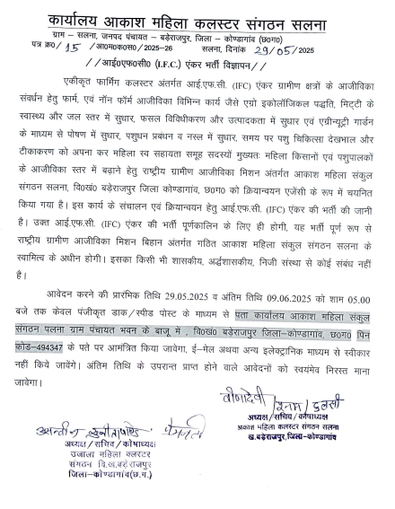 कार्यालय आकाश महिला कलस्टर संगठन सलना, बड़ेराजपुर, कोण्डागांव ने एकीकृत फार्मिंग कलस्टर (IFC) के अंतर्गत आई.एफ.सी. (IFC) एंकर के पद पर भर्ती के लिए विज्ञापन जारी किया है। यह भर्ती राष्ट्रीय ग्रामीण आजीविका मिशन (बिहान) के तहत संचालित हो रही है, जिसमें आकाश महिला संकुल संगठन सलना को क्रियान्वयन एजेंसी के रूप में चुना गया है। यह पद पूर्णकालिक है और संगठन के स्वामित्व के अधीन होगा, इसका किसी भी शासकीय, अर्द्धशासकीय या निजी संस्था से सीधा संबंध नहीं है।