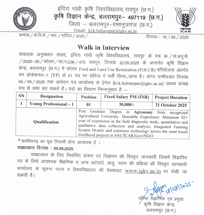 KVK Balrampur Recruitment 2025 इंदिरा गांधी कृषि विश्वविद्यालय, रायपुर के अंतर्गत आने वाले कृषि विज्ञान केंद्र, बलरामपुर ने यंग प्रोफेशनल के पद पर भर्ती के लिए एक आधिकारिक सूचना जारी की है। यह उन उम्मीदवारों के लिए एक बेहतरीन मौका है जो कृषि में अपना करियर बनाना चाहते हैं और छत्तीसगढ़ के विकास में योगदान देना चाहते हैं। CG Krishi Vigyan Kendra Jobs