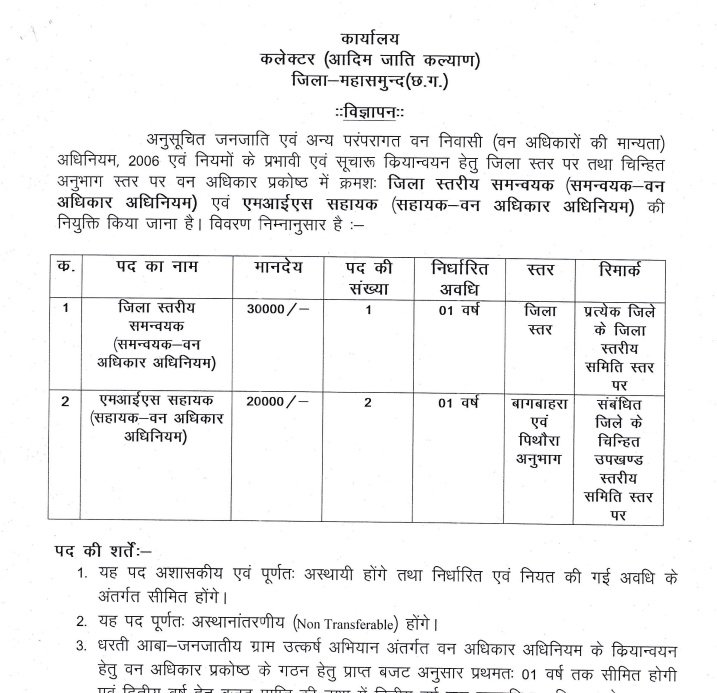 Mahasamund Collector Office Recruitment 2025 कलेक्टर कार्यालय (आदिम जाति कल्याण), जिला-महासमुंद (छ.ग.) ने जिला स्तरीय समन्वयक और एमआईएस सहायक के पदों पर भर्ती के लिए एक आधिकारिक विज्ञापन जारी किया है। Mahasamund recruitment 2025