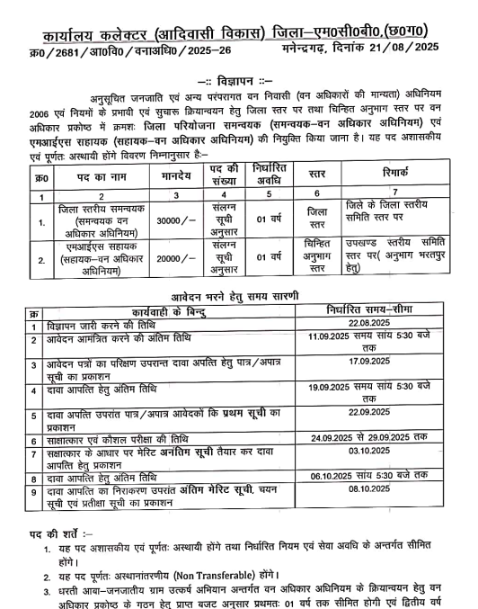MCB Collector Office Recruitment 2025 कार्यालय कलेक्टर (आदिवासी विकास), जिला-मनेन्द्रगढ़-चिरमिरी-भरतपुर (MCB) ने वन अधिकार अधिनियम के सफल कार्यान्वयन के लिए कुछ महत्वपूर्ण पदों पर भर्ती निकाली है। District Coordinator Jobs in Chhattisgarh