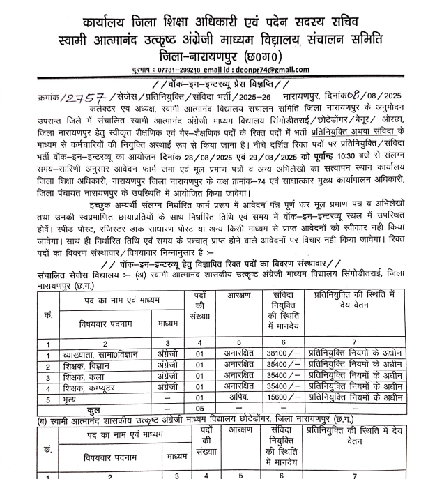 नारायणपुर में स्पेशल एजुकेटर के ये पद उन लोगों के लिए एक बेहतरीन अवसर हैं जो विशेष बच्चों के जीवन में बदलाव लाना चाहते हैं। यह न केवल एक सम्मानजनक करियर है, बल्कि समाज में योगदान देने का भी एक सुनहरा मौका है। अगर आप निर्धारित योग्यताओं को पूरा करते हैं, तो बिना देर किए आवेदन करें और 19 अगस्त 2025 को इंटरव्यू के लिए तैयार रहें।
