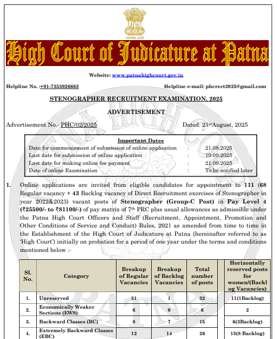 Patna High Court Recruitment 2025 पटना हाई कोर्ट (Patna High Court) ने स्टेनोग्राफर (Group-C) के प्रतिष्ठित पदों के लिए भर्ती का नोटिफिकेशन जारी कर दिया है। इस भर्ती अभियान के तहत कुल 111 पदों को भरा जाएगा, जो 12वीं पास उम्मीदवारों के लिए एक सुनहरा मौका है।