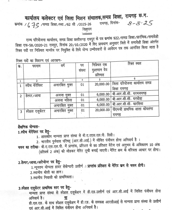 Raigarh recruitment 2025 🎯 कार्यालय कलेक्टर एवं जिला मिशन संचालक, समग्र शिक्षा, रायगढ़ ने विभिन्न पदों पर भर्ती के लिए एक आधिकारिक विज्ञापन जारी किया है। इस भर्ती अभियान के तहत स्पीच थेरेपिस्ट, स्पेशल एजुकेटर, और हेल्पर/आया जैसे कुल 05 पदों को भरा जाना है।