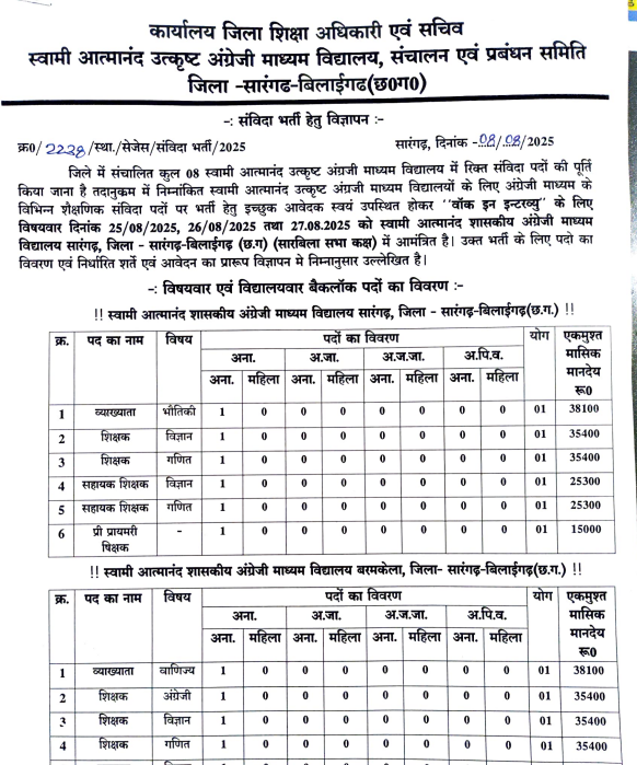 Sarangarh Bilaigarh Swami Atmanand School Vacancy 2025: सारंगढ़-बिलाईगढ़ जिले के स्वामी आत्मानंद उत्कृष्ट अंग्रेजी माध्यम विद्यालयों (SAGES) ने आपके लिए एक शानदार अवसर पेश किया है! इन विद्यालयों में विभिन्न शैक्षणिक संविदा पदों पर भर्ती के लिए वॉक-इन इंटरव्यू का आयोजन किया जा रहा है। Swami Atmanand School Recruitment 2025 यह भर्ती कुल 36 रिक्तियों को भरने के लिए है, जिसमें व्याख्याता, शिक्षक, सहायक शिक्षक, कंप्यूटर शिक्षक और प्री-प्राइमरी शिक्षक जैसे पद शामिल हैं। इच्छुक और योग्य उम्मीदवार सीधे निर्धारित तिथि पर वॉक-इन इंटरव्यू में शामिल हो सकते हैं। यह सुनहरा मौका 25, 26 और 27 अगस्त 2025 को आपके लिए है। Teacher Jobs in English Medium School