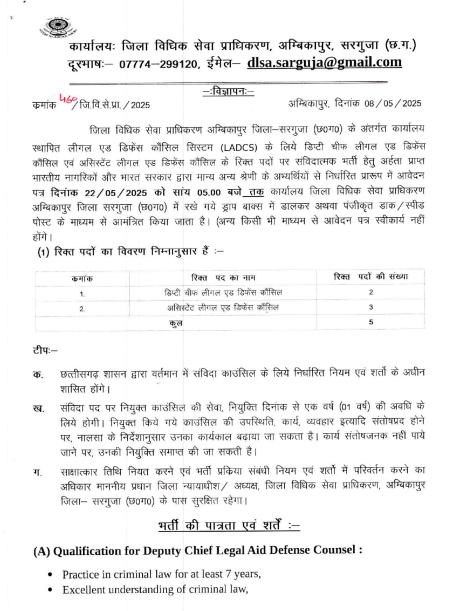 Sarguja DLSA Vacancy 2025: सरगुजा जिला विधिक सेवा प्राधिकरण (DLSA) ने डिप्टी चीफ और असिस्टेंट लीगल एड डिफेंस कौंसिल के 5 पदों पर भर्ती 2025 की घोषणा की है। अंतिम तिथि 22 मई 2025। जानें पूरी पात्रता, वेतन, और आवेदन प्रक्रिया। छत्तीसगढ़ में सरकारी नौकरी का सुनहरा अवसर।