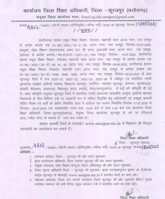 Surajpur Swami Atmanand School Vacancy 2025: जिला शिक्षा अधिकारी कार्यालय, सूरजपुर ने स्वामी आत्मानंद शासकीय उत्कृष्ट (अंग्रेजी माध्यम) विद्यालयों (SAGES) में विभिन्न शिक्षण और गैर-शिक्षण पदों पर भर्ती के लिए एक विज्ञापन जारी किया है। Surajpur teacher vacancy
