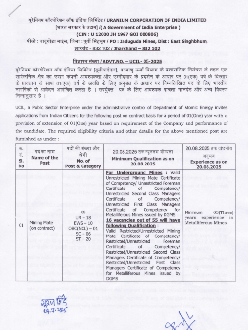 UCIL Recruitment 2025:✨ यूरेनियम कॉर्पोरेशन ऑफ इंडिया लिमिटेड (UCIL) ने माइनिंग मेट के 55 पदों के लिए भर्ती निकाली है। आवेदन की अंतिम तिथि 20.08.2025 है। जानें योग्यता, आयु सीमा, सैलरी और आवेदन प्रक्रिया की पूरी जानकारी। अभी अप्लाई करें